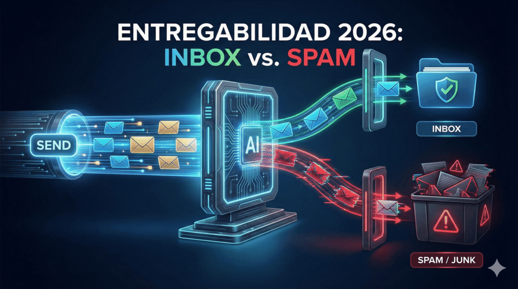 Bienvenido al complejo mundo de la Entregabilidad (Deliverability). En 2026, lograr que un correo llegue a su destino es una batalla técnica contra los algoritmos de filtrado de IA de Google, Microsoft y Apple.